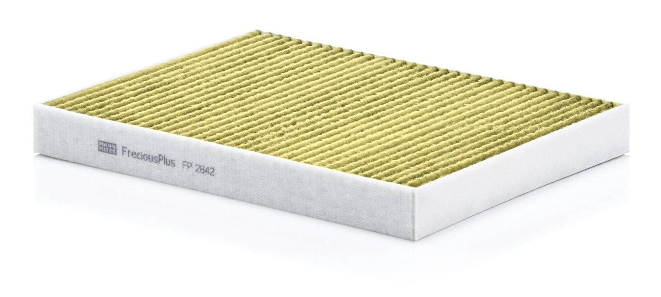 Biofunctional MANN-FILTER FreciousPlus cabin air filters - nearly 100% protection against nitrogen oxides, dust, allergens and mould - harmful gases and unpleasant odours are also eliminated and virus aerosols filtered. The three-layer filter technology absorbs almost 100% of allergens, reduces the growth of molds and bacteria by more than 98% and stops fine dust almost completely.Specification