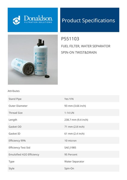 Genuine Donaldson P551103 Fuel Filter, Water Separator Spin-On Twist&Drain effectively separates water and contaminants from diesel fuel, ensuring clean fuel delivery and preventing engine damage. Its twist-and-drain feature allows for easy water removal.Ideal for trucks, marine engines, and heavy equipment, this filter helps maintain fuel system integrity and efficiency.