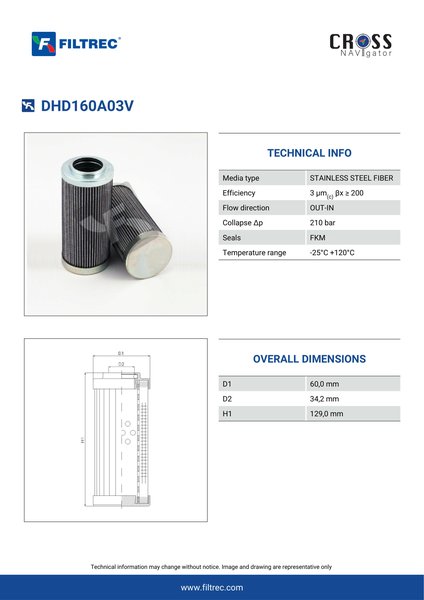 Genuine Filtrec DHD160A03V. This Filtrec element is designed to meet or exceed the quality and performance of brand OEM’s ensuring superior filtration performance and long-lasting durability.