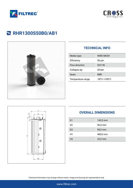 Genuine Filtrec RHR1300S50B0/AB1. This Filtrec element is designed to meet or exceed the quality and performance of brand OEM’s ensuring superior filtration performance and long-lasting durability.Engineered with their high performance media and a durable design, the RHR1300S50B0/AB1 provides reliable and consistent performance over its lifespan, even in harsh operating environments. When you order from FilterFinder, you can trust that you are getting a reliable and high-quality replacement filter that will keep your system running smoothly.