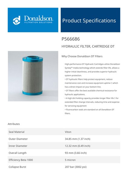 Genuine Donaldson P566686 Hydraulic Filter, Cartridge Dt is engineered with advanced depth filtration technology, offering enhanced dirt retention and fluid cleanliness. It ensures optimal performance in high-pressure hydraulic systems, effectively protecting critical components from wear and extending system life.This filters robust construction and superior filtration efficiency make it ideal for demanding applications. Its reliable performance helps minimize maintenance costs and system downtime, ensuring consistent operation under tough conditions.