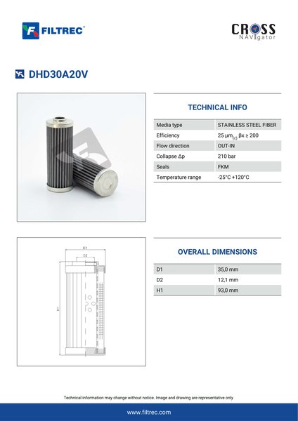 Genuine Filtrec DHD30A20V. This Filtrec element is designed to meet or exceed the quality and performance of brand OEM’s ensuring superior filtration performance and long-lasting durability.