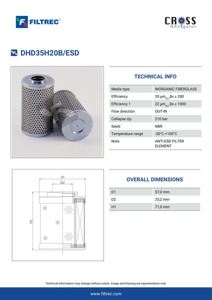 Genuine Filtrec DHD35H20B/ESD. This Filtrec element is designed to meet or exceed the quality and performance of brand OEM’s ensuring superior filtration performance and long-lasting durability.