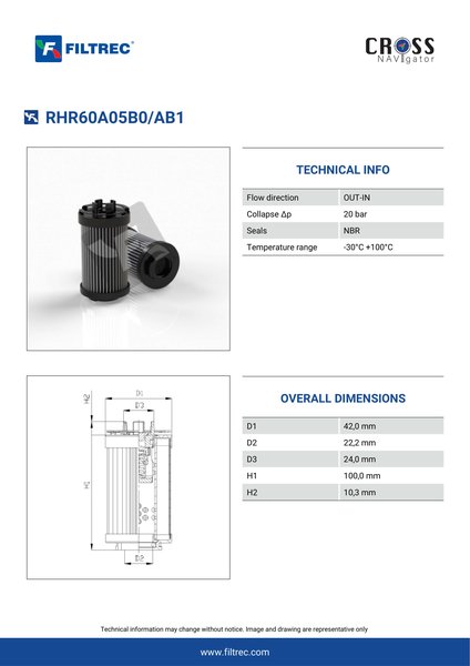 Genuine Filtrec RHR60A05B0/AB1. This Filtrec element is designed to meet or exceed the quality and performance of brand OEM’s ensuring superior filtration performance and long-lasting durability.Engineered with their high performance media and a durable design, the RHR60A05B0/AB1 provides reliable and consistent performance over its lifespan, even in harsh operating environments. When you order from FilterFinder, you can trust that you are getting a reliable and high-quality replacement filter that will keep your system running smoothly.