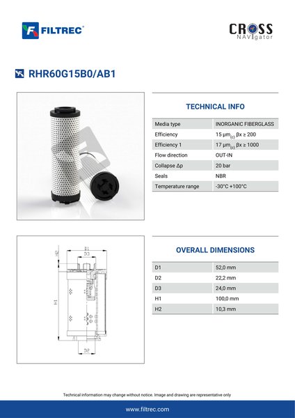 Genuine Filtrec RHR60G15B0/AB1. This Filtrec element is designed to meet or exceed the quality and performance of brand OEM’s ensuring superior filtration performance and long-lasting durability.Engineered with their high performance media and a durable design, the RHR60G15B0/AB1 provides reliable and consistent performance over its lifespan, even in harsh operating environments. When you order from FilterFinder, you can trust that you are getting a reliable and high-quality replacement filter that will keep your system running smoothly.