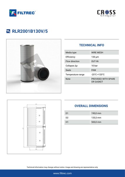 Genuine Filtrec RLR2001B130V/5. This Filtrec element is designed to meet or exceed the quality and performance of brand OEM’s ensuring superior filtration performance and long-lasting durability.