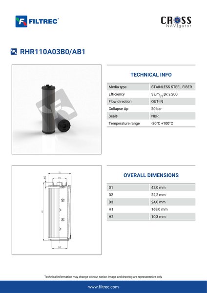 The efficiency of the element is shown using the Micron (µ) and Beta (β) ratings. The micron rating indicates the size of the particle being filtered and the beta rating the efficiency, calculated as 1/β.