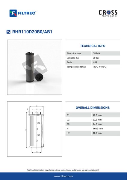 Genuine Filtrec RHR110D20B0/AB1. This Filtrec element is designed to meet or exceed the quality and performance of brand OEM’s ensuring superior filtration performance and long-lasting durability.