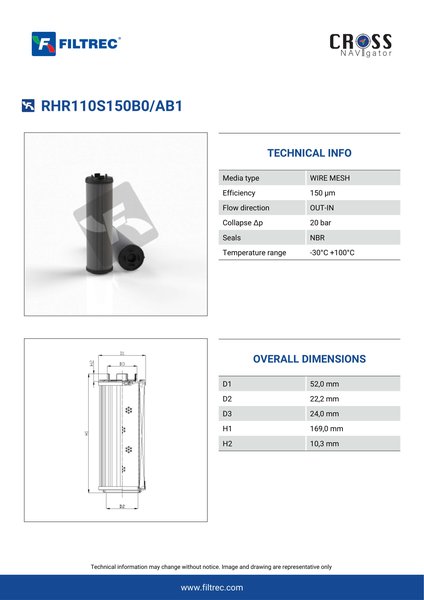 Engineered with their high performance media and a durable design, the RHR110S150B0/AB1 provides reliable and consistent performance over its lifespan, even in harsh operating environments. When you order from FilterFinder, you can trust that you are getting a reliable and high-quality replacement filter that will keep your system running smoothly.