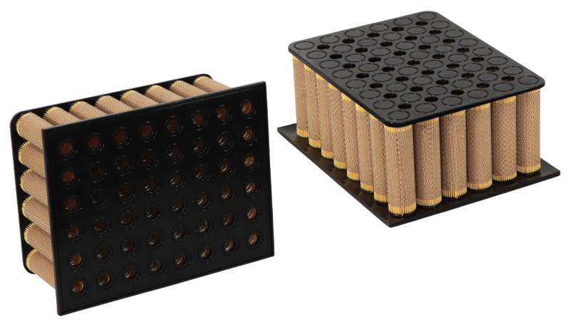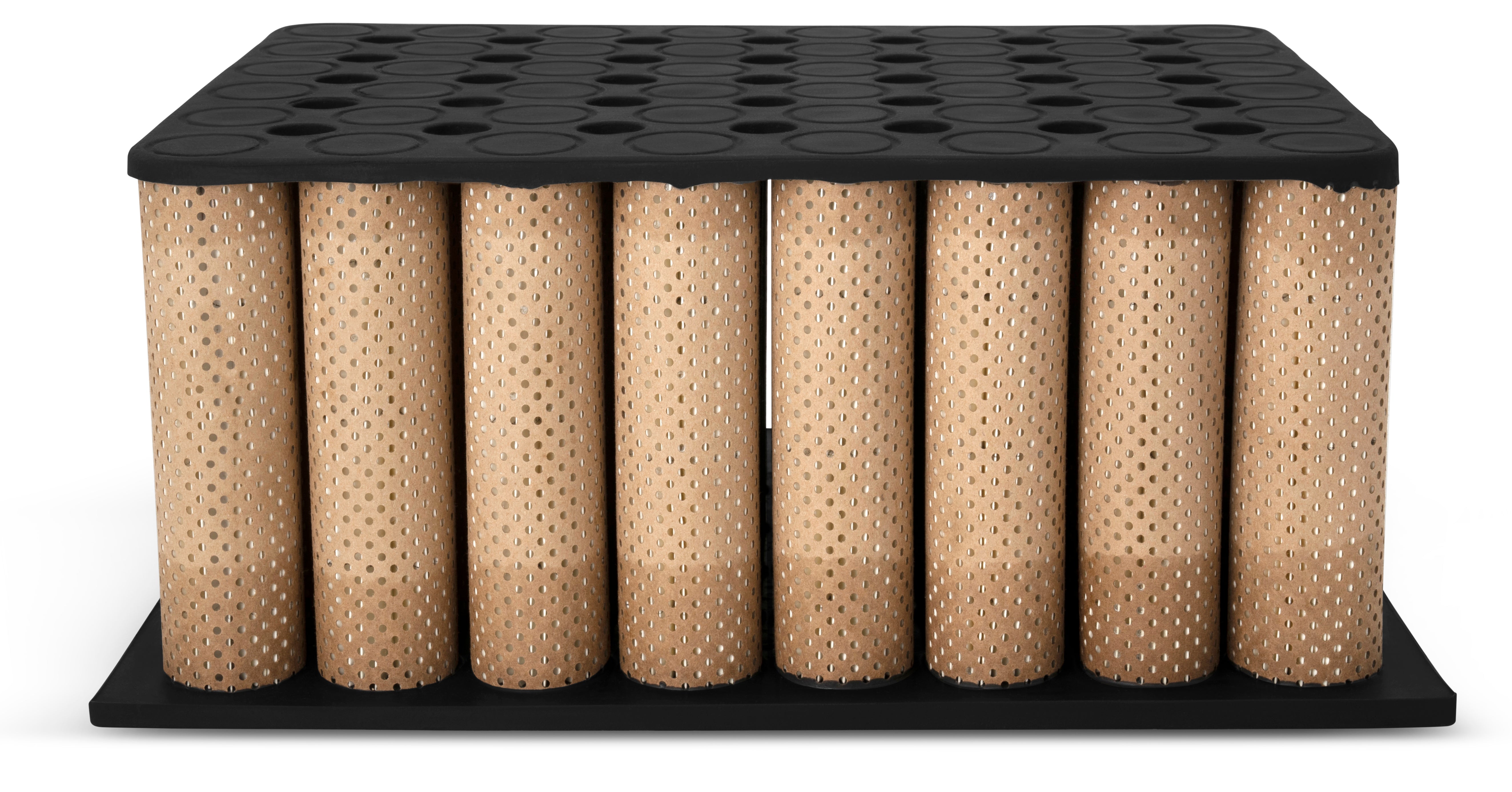 The efficiency of the element is shown using the Micron (µ) and Beta (β) ratings. The micron rating indicates the size of the particle being filtered and the beta rating the efficiency, calculated as 1/β.