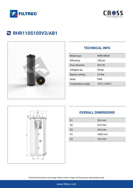 Genuine Filtrec RHR110S100V3/AB1. This Filtrec element is designed to meet or exceed the quality and performance of brand OEM’s ensuring superior filtration performance and long-lasting durability.Engineered with their high performance media and a durable design, the RHR110S100V3/AB1 provides reliable and consistent performance over its lifespan, even in harsh operating environments. When you order from FilterFinder, you can trust that you are getting a reliable and high-quality replacement filter that will keep your system running smoothly.
