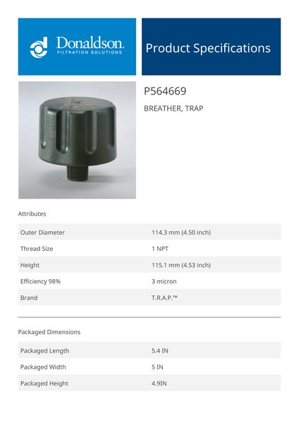 Genuine Donaldson P564669 Breather, Trap is designed to provide reliable performance in breather, trap applications. Built with high-quality materials, it ensures consistent functionality and durability.Ideal for industrial, automotive, or heavy-duty environments, this component enhances system performance and longevity.