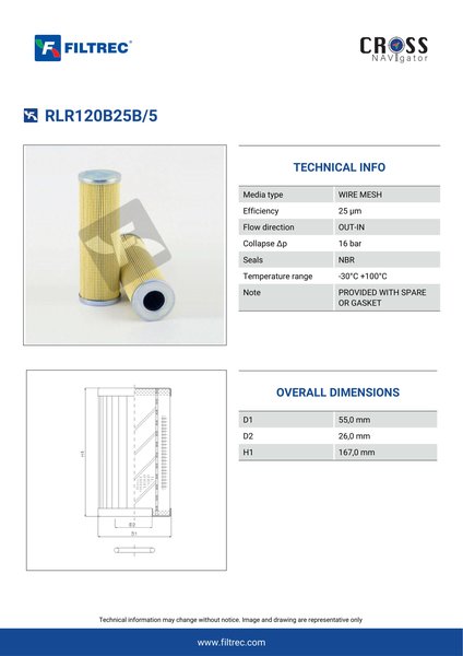 Genuine Filtrec RLR120B25B/5. This Filtrec element is designed to meet or exceed the quality and performance of brand OEM’s ensuring superior filtration performance and long-lasting durability.