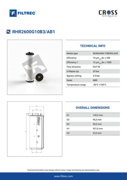 Genuine Filtrec RHR2600G10B3/AB1. This Filtrec element is designed to meet or exceed the quality and performance of brand OEM’s ensuring superior filtration performance and long-lasting durability.Engineered with their high performance media and a durable design, the RHR2600G10B3/AB1 provides reliable and consistent performance over its lifespan, even in harsh operating environments. When you order from FilterFinder, you can trust that you are getting a reliable and high-quality replacement filter that will keep your system running smoothly.