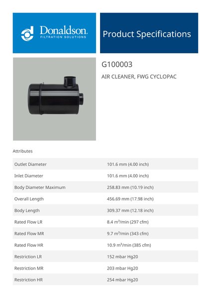 Genuine Donaldson G100003 Air Cleaner, Fwg Cyclopac is engineered to deliver reliable performance and durability across a wide range of applications. Designed with high-quality materials, it ensures consistent functionality while meeting demanding operational requirements.