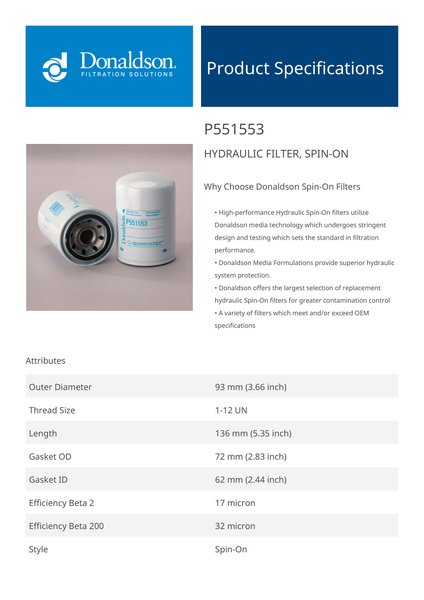 Genuine Donaldson P551553 Hydraulic Filter, Spin-On provides dependable protection for hydraulic systems by efficiently removing particulates and contaminants. It ensures clean hydraulic fluid, promoting smooth operation and extending the lifespan of critical system components.With its easy-to-install spin-on design, this filter minimizes downtime and maintenance costs. Its durable construction and advanced filtration media make it a trusted choice for industrial and mobile hydraulic applications requiring reliable performance.