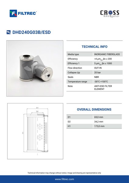 Genuine Filtrec DHD240G03B/ESD. This Filtrec element is designed to meet or exceed the quality and performance of brand OEM’s ensuring superior filtration performance and long-lasting durability.Engineered with their high performance media and a durable design, the DHD240G03B/ESD provides reliable and consistent performance over its lifespan, even in harsh operating environments. When you order from FilterFinder, you can trust that you are getting a reliable and high-quality replacement filter that will keep your system running smoothly.