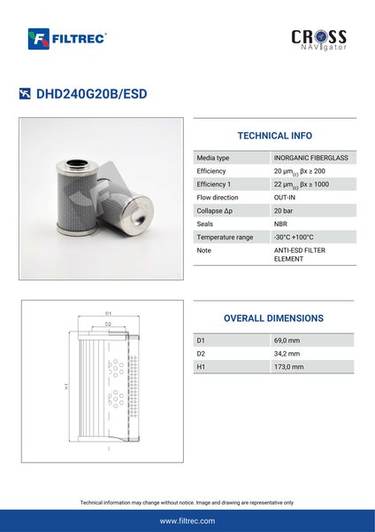 Engineered with their high performance media and a durable design, the DHD240G20B/ESD provides reliable and consistent performance over its lifespan, even in harsh operating environments. When you order from FilterFinder, you can trust that you are getting a reliable and high-quality replacement filter that will keep your system running smoothly.