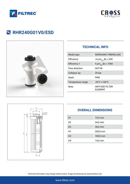 The efficiency of the element is shown using the Micron (µ) and Beta (β) ratings. The micron rating indicates the size of the particle being filtered and the beta rating the efficiency, calculated as 1/β.