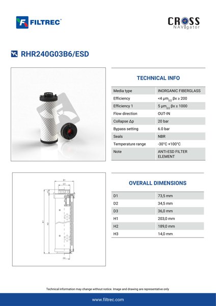 The efficiency of the element is shown using the Micron (µ) and Beta (β) ratings. The micron rating indicates the size of the particle being filtered and the beta rating the efficiency, calculated as 1/β.