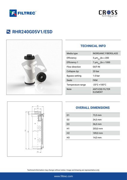 Genuine Filtrec RHR240G05V1/ESD. This Filtrec element is designed to meet or exceed the quality and performance of brand OEM’s ensuring superior filtration performance and long-lasting durability.Engineered with their high performance media and a durable design, the RHR240G05V1/ESD provides reliable and consistent performance over its lifespan, even in harsh operating environments. When you order from FilterFinder, you can trust that you are getting a reliable and high-quality replacement filter that will keep your system running smoothly.