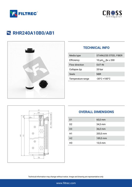Genuine Filtrec RHR240A10B0/AB1. This Filtrec element is designed to meet or exceed the quality and performance of brand OEM’s ensuring superior filtration performance and long-lasting durability.