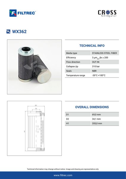 The efficiency of the element is shown using the Micron (µ) and Beta (β) ratings. The micron rating indicates the size of the particle being filtered and the beta rating the efficiency, calculated as 1/β.