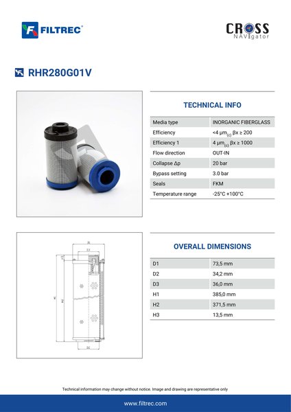 Engineered with their high performance media and a durable design, the RHR280G01V provides reliable and consistent performance over its lifespan, even in harsh operating environments. When you order from FilterFinder, you can trust that you are getting a reliable and high-quality replacement filter that will keep your system running smoothly.