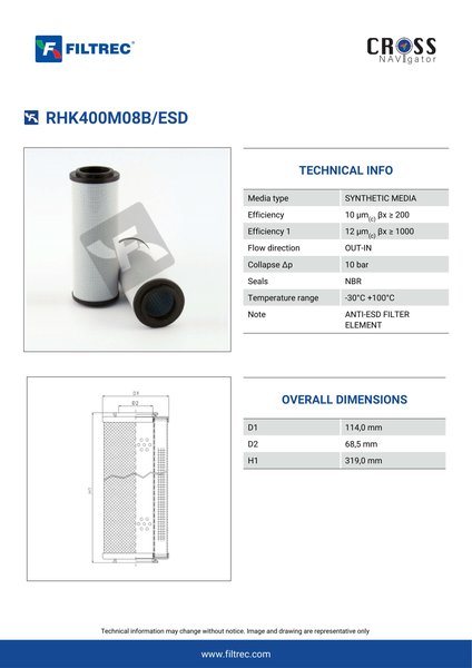 The efficiency of the element is shown using the Micron (µ) and Beta (β) ratings. The micron rating indicates the size of the particle being filtered and the beta rating the efficiency, calculated as 1/β.