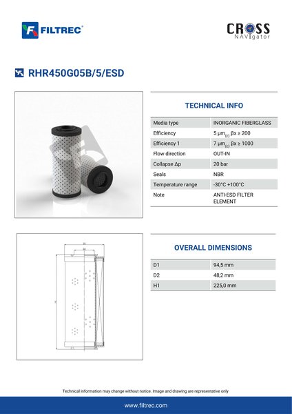 Genuine Filtrec RHR450G05B/5/ESD. This Filtrec element is designed to meet or exceed the quality and performance of brand OEM’s ensuring superior filtration performance and long-lasting durability.Engineered with their high performance media and a durable design, the RHR450G05B/5/ESD provides reliable and consistent performance over its lifespan, even in harsh operating environments. When you order from FilterFinder, you can trust that you are getting a reliable and high-quality replacement filter that will keep your system running smoothly.