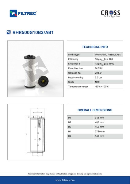 Genuine Filtrec RHR500G10B3/AB1. This Filtrec element is designed to meet or exceed the quality and performance of brand OEM’s ensuring superior filtration performance and long-lasting durability.Engineered with their high performance media and a durable design, the RHR500G10B3/AB1 provides reliable and consistent performance over its lifespan, even in harsh operating environments. When you order from FilterFinder, you can trust that you are getting a reliable and high-quality replacement filter that will keep your system running smoothly.
