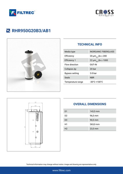 Genuine Filtrec RHR950G20B3/AB1. This Filtrec element is designed to meet or exceed the quality and performance of brand OEM’s ensuring superior filtration performance and long-lasting durability.Engineered with their high performance media and a durable design, the RHR950G20B3/AB1 provides reliable and consistent performance over its lifespan, even in harsh operating environments. When you order from FilterFinder, you can trust that you are getting a reliable and high-quality replacement filter that will keep your system running smoothly.
