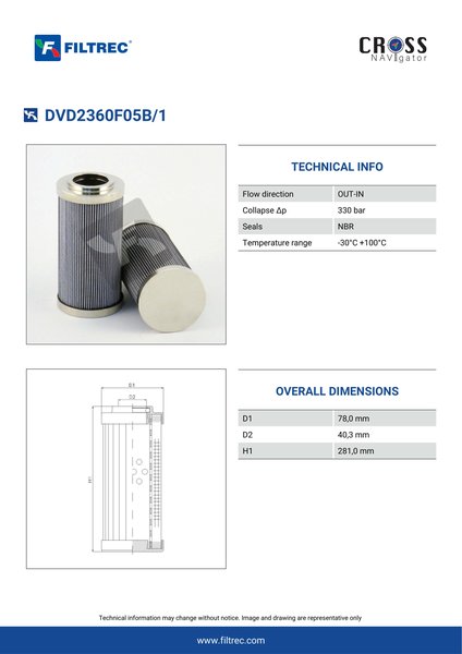 Genuine Filtrec DVD2360F05B/1. This Filtrec element is designed to meet or exceed the quality and performance of brand OEM’s ensuring superior filtration performance and long-lasting durability.