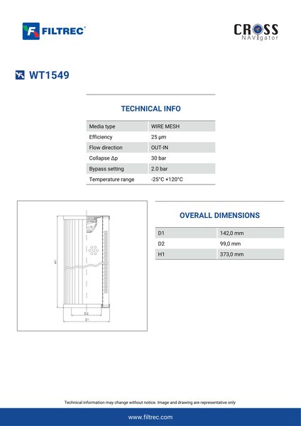Genuine Filtrec WT1549. This Filtrec element is designed to meet or exceed the quality and performance of brand OEM’s ensuring superior filtration performance and long-lasting durability.