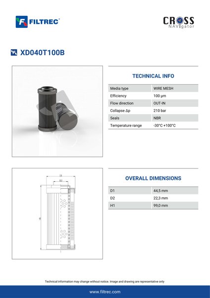 Genuine Filtrec XD040T100B. This Filtrec element is designed to meet or exceed the quality and performance of brand OEM’s ensuring superior filtration performance and long-lasting durability.