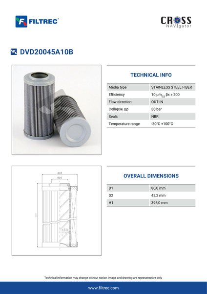 Genuine Filtrec DVD20045A10B. This Filtrec element is designed to meet or exceed the quality and performance of brand OEM’s ensuring superior filtration performance and long-lasting durability.