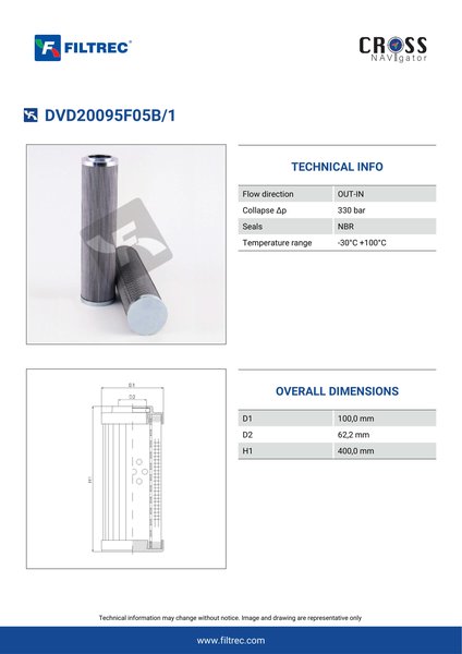 Genuine Filtrec DVD20095F05B/1. This Filtrec element is designed to meet or exceed the quality and performance of brand OEM’s ensuring superior filtration performance and long-lasting durability.Engineered with their high performance media and a durable design, the DVD20095F05B/1 provides reliable and consistent performance over its lifespan, even in harsh operating environments. When you order from FilterFinder, you can trust that you are getting a reliable and high-quality replacement filter that will keep your system running smoothly.
