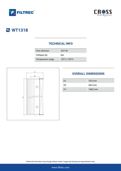Genuine Filtrec WT1318. This Filtrec element is designed to meet or exceed the quality and performance of brand OEM’s ensuring superior filtration performance and long-lasting durability.