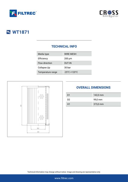 Genuine Filtrec WT1871. This Filtrec element is designed to meet or exceed the quality and performance of brand OEM’s ensuring superior filtration performance and long-lasting durability.