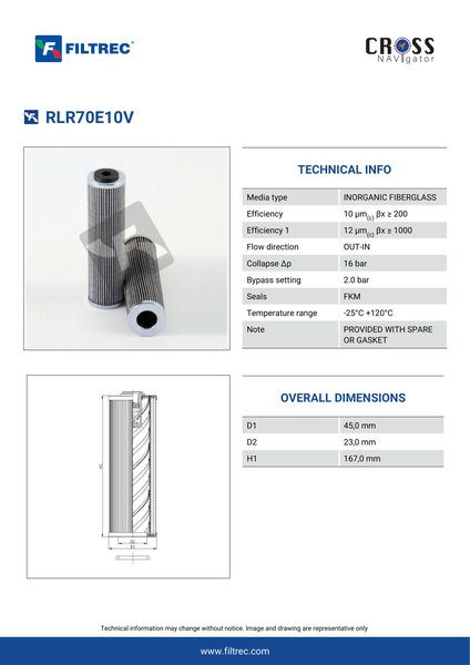 Genuine Filtrec RLR70E10V. This Filtrec element is designed to meet or exceed the quality and performance of brand OEM’s ensuring superior filtration performance and long-lasting durability.Engineered with their high performance media and a durable design, the RLR70E10V provides reliable and consistent performance over its lifespan, even in harsh operating environments. When you order from FilterFinder, you can trust that you are getting a reliable and high-quality replacement filter that will keep your system running smoothly.