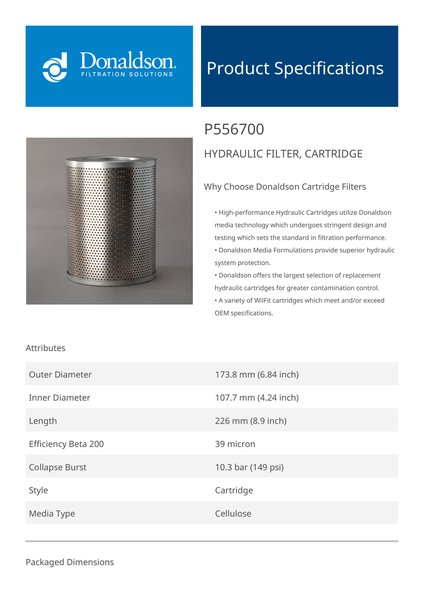 Genuine Donaldson P556700 Hydraulic Filter, Cartridge is designed to provide superior protection for your hydraulic system, effectively capturing contaminants to ensure clean fluid circulation. With high-quality filtration media, it extends equipment life, improves operational efficiency, and maintains fluid cleanliness even in the most demanding environments.