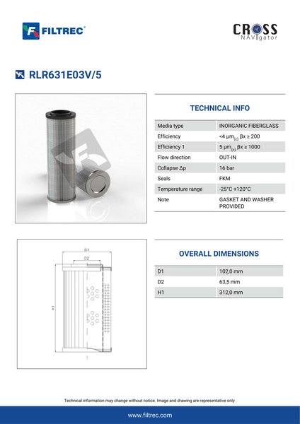 Genuine Filtrec RLR631E03V/5. This Filtrec element is designed to meet or exceed the quality and performance of brand OEM’s ensuring superior filtration performance and long-lasting durability.