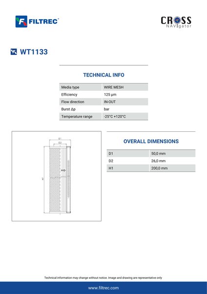 Genuine Filtrec WT1133. This Filtrec element is designed to meet or exceed the quality and performance of brand OEM’s ensuring superior filtration performance and long-lasting durability.
