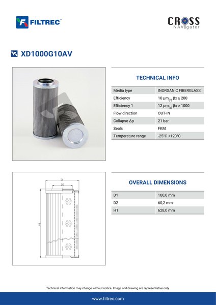 Genuine Filtrec XD1000G10AV. This Filtrec element is designed to meet or exceed the quality and performance of brand OEM’s ensuring superior filtration performance and long-lasting durability.