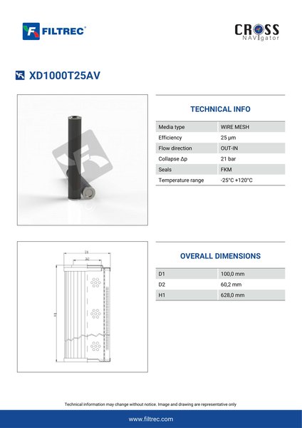 Genuine Filtrec XD1000T25AV. This Filtrec element is designed to meet or exceed the quality and performance of brand OEM’s ensuring superior filtration performance and long-lasting durability.