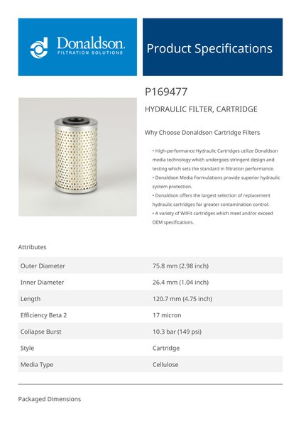 Genuine Donaldson P169477 Hydraulic Filter, Cartridge is designed to provide superior protection for your hydraulic system, effectively capturing contaminants to ensure clean fluid circulation. With high-quality filtration media, it extends equipment life, improves operational efficiency, and maintains fluid cleanliness even in the most demanding environments.
