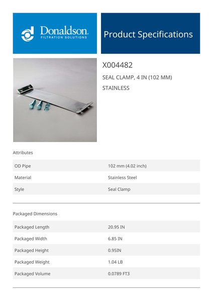 Genuine Donaldson X004482 Seal Clamp, 4 In (102 Mm) Stainless is engineered to deliver reliable performance and durability across a wide range of applications. Designed with high-quality materials, it ensures consistent functionality while meeting demanding operational requirements.