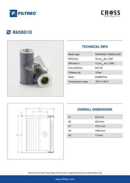 Genuine Filtrec R650G10. This Filtrec element is designed to meet or exceed the quality and performance of brand OEM’s ensuring superior filtration performance and long-lasting durability.Engineered with their high performance media and a durable design, the R650G10 provides reliable and consistent performance over its lifespan, even in harsh operating environments. When you order from FilterFinder, you can trust that you are getting a reliable and high-quality replacement filter that will keep your system running smoothly.