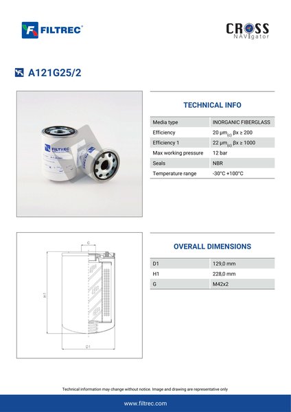 Engineered with their high performance media and a durable design, the A121G25/2 provides reliable and consistent performance over its lifespan, even in harsh operating environments. When you order from FilterFinder, you can trust that you are getting a reliable and high-quality replacement filter that will keep your system running smoothly.