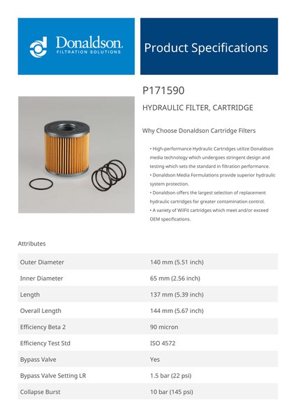 Genuine Donaldson P171590 Hydraulic Filter, Cartridge is designed to provide superior protection for your hydraulic system, effectively capturing contaminants to ensure clean fluid circulation. With high-quality filtration media, it extends equipment life, improves operational efficiency, and maintains fluid cleanliness even in the most demanding environments.